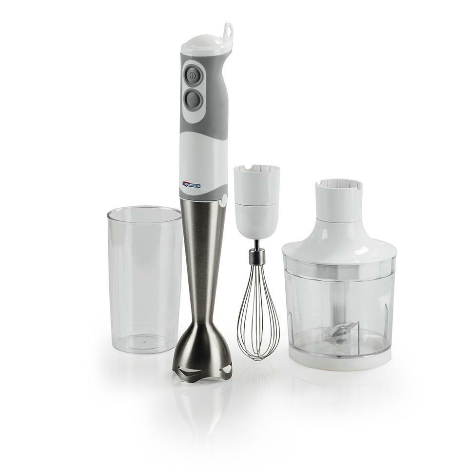 - Frullatore a immersione con accessorio sbattitore: una frusta in acciaio inox ideale per sbattere, montare e miscelare.